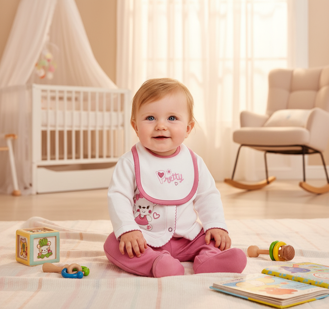 El CONJUNTO PRETTY está diseñado con PIMA, una tela de alta calidad que garantiza suavidad y comodidad para tu bebé. Además, su hermoso color palo rosa le brinda un toque dulce y femenino. ¡Haz que tu bebé luzca adorable y cómoda con este ajuar.