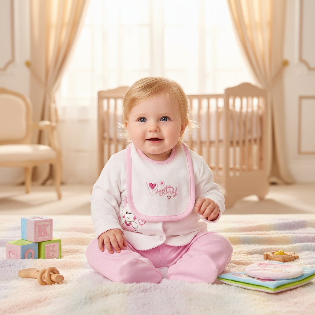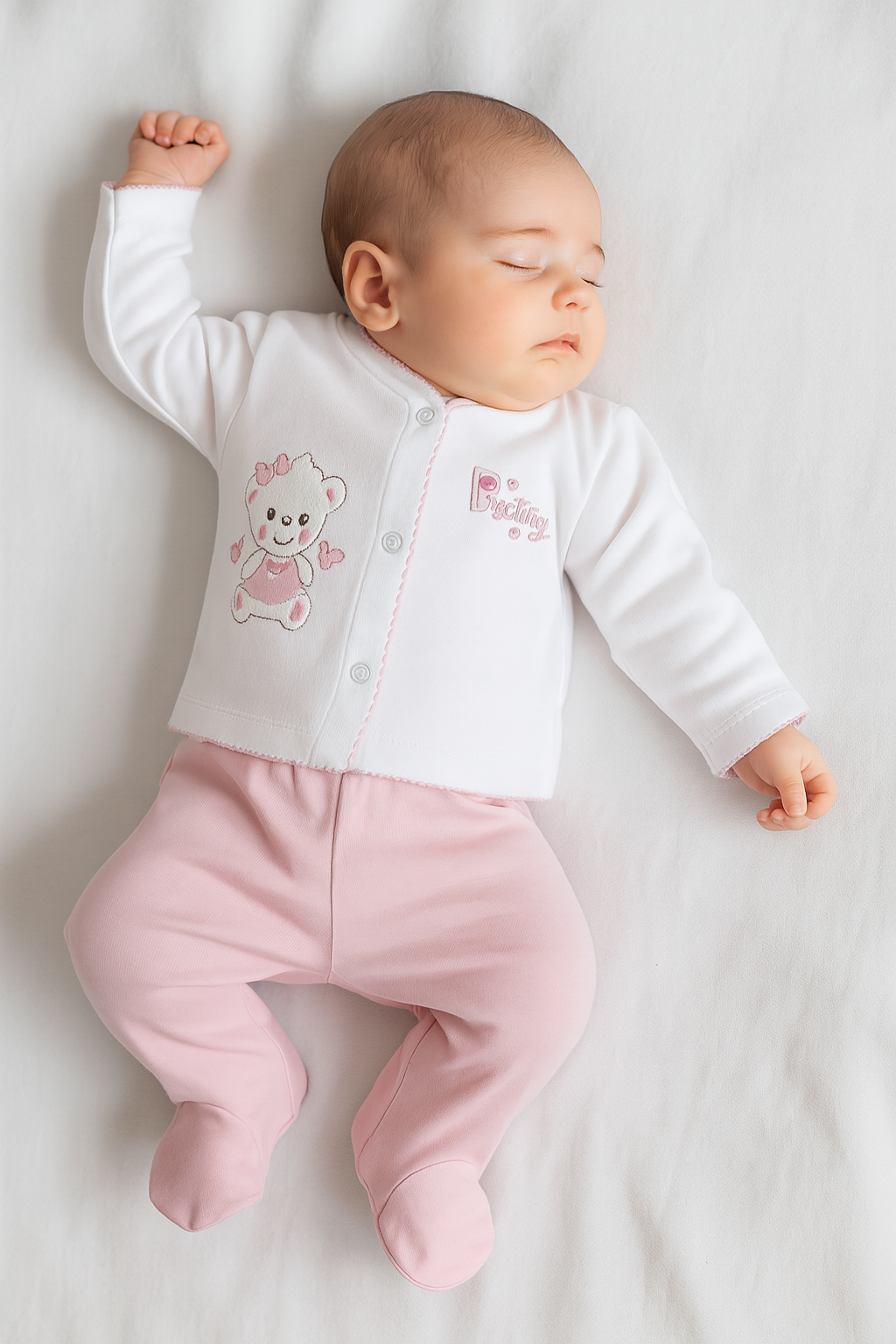 El CONJUNTO PRETTY está diseñado con PIMA, una tela de alta calidad que garantiza suavidad y comodidad para tu bebé. Además, su hermoso color rosado le brinda un toque dulce y femenino. ¡Haz que tu bebé luzca adorable y cómoda con este ajuar.
