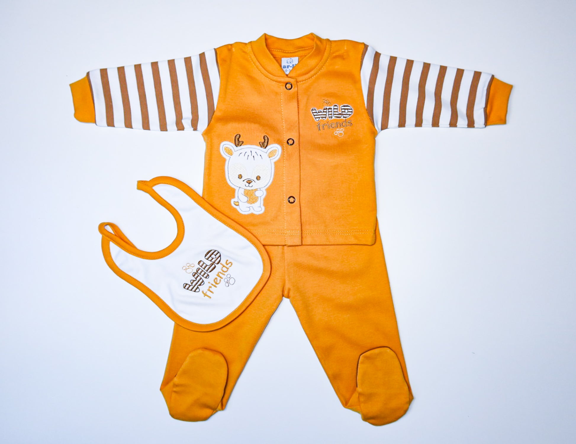 El Conjunto Varoncito Wild Friends en color mostaza está confeccionado con suave algodón Pima para la delicada piel del bebé. El conjunto incluye prendas esenciales para mantener al recién nacido cómodo y cálido mientras luce un estampado divertido y original.
