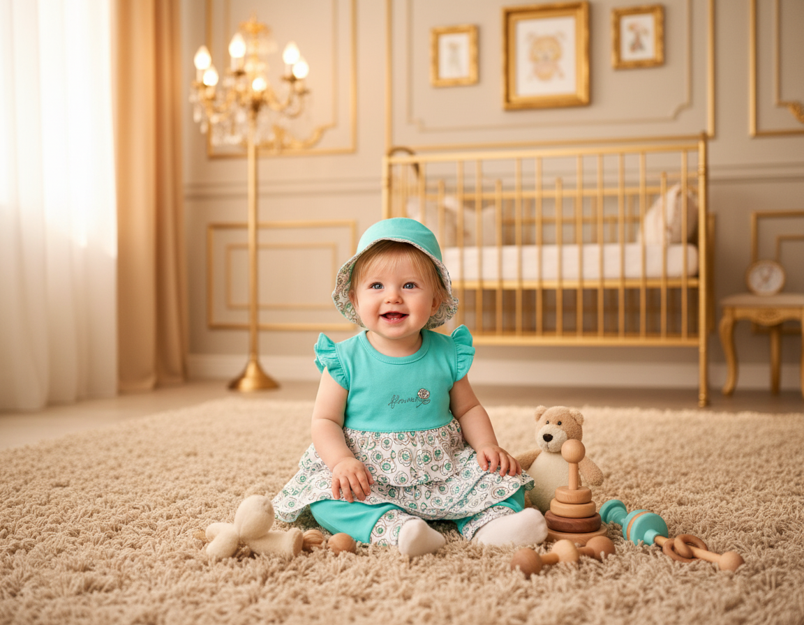 Este encantador vestido de ajuar para bebé está confeccionado con suave y delicado algodón Pima, con un hermoso tono cemento verde y un estampado de flores. Perfecto para mantener a tu bebé cómodo y elegante al mismo tiempo. ¡Un imprescindible para cualquier guardarropa de bebé!