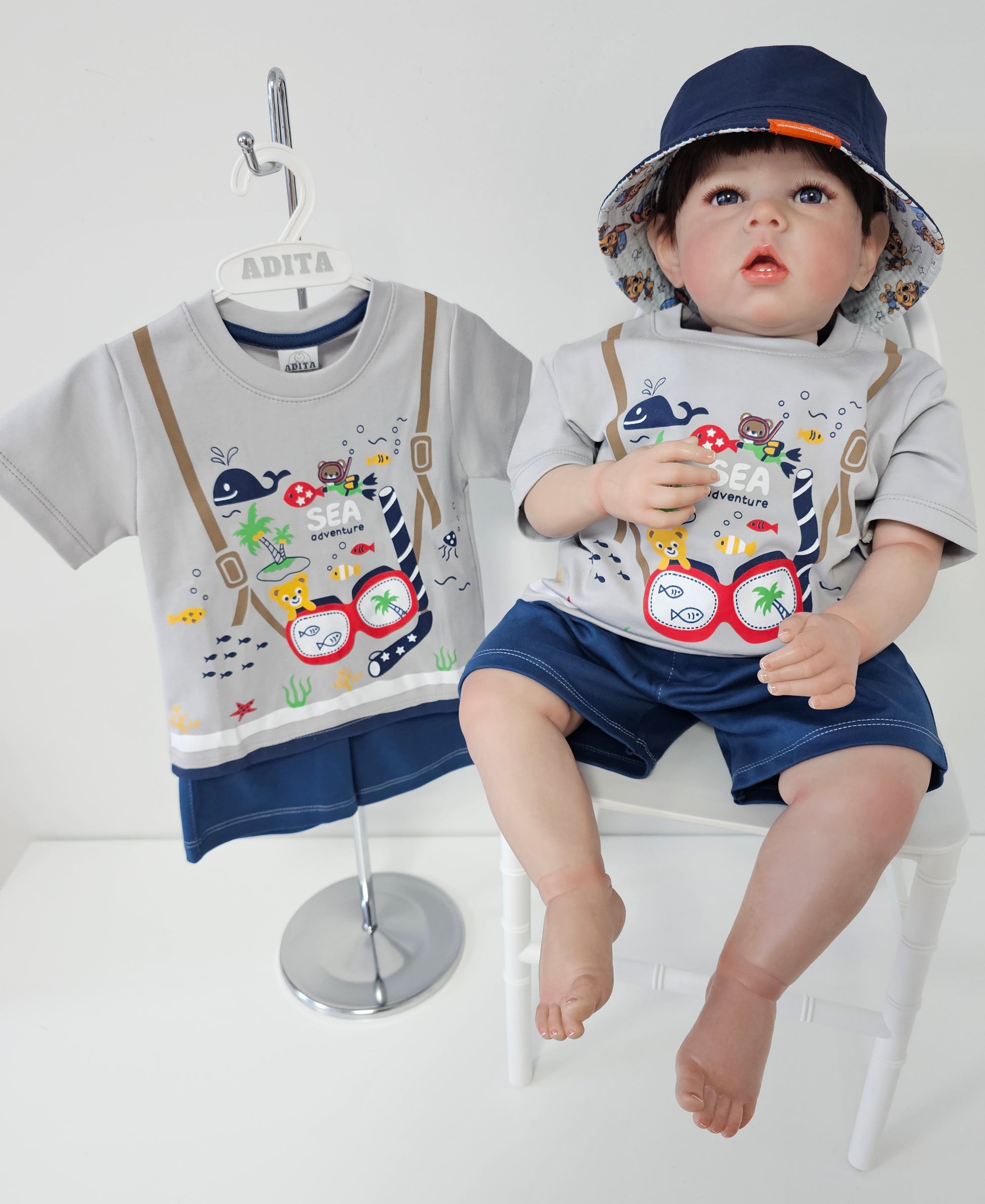 El CONJUNTO SEA ADVENTURE es la opción perfecta para tu bebé, confeccionado en 100% algodón Pima para garantizar su comodidad y suavidad en todo momento. Incluye un polo color plomo y un short en color azul, ideal para sus aventuras en el mar.