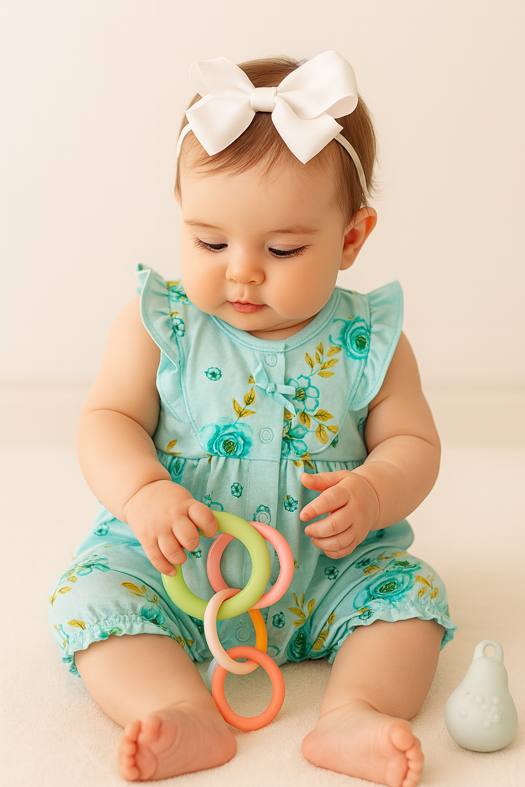 ¡Haz que tu bebé se sienta cómoda y se vea hermosa con nuestro enterizo de algodón Pima corto en color verde agua! Perfecto para el verano, este mameluco ofrece suavidad y frescura, y le da un toque de color al guardarropa de tu bebé. ¡Un básico imprescindible para cualquier ocasión!