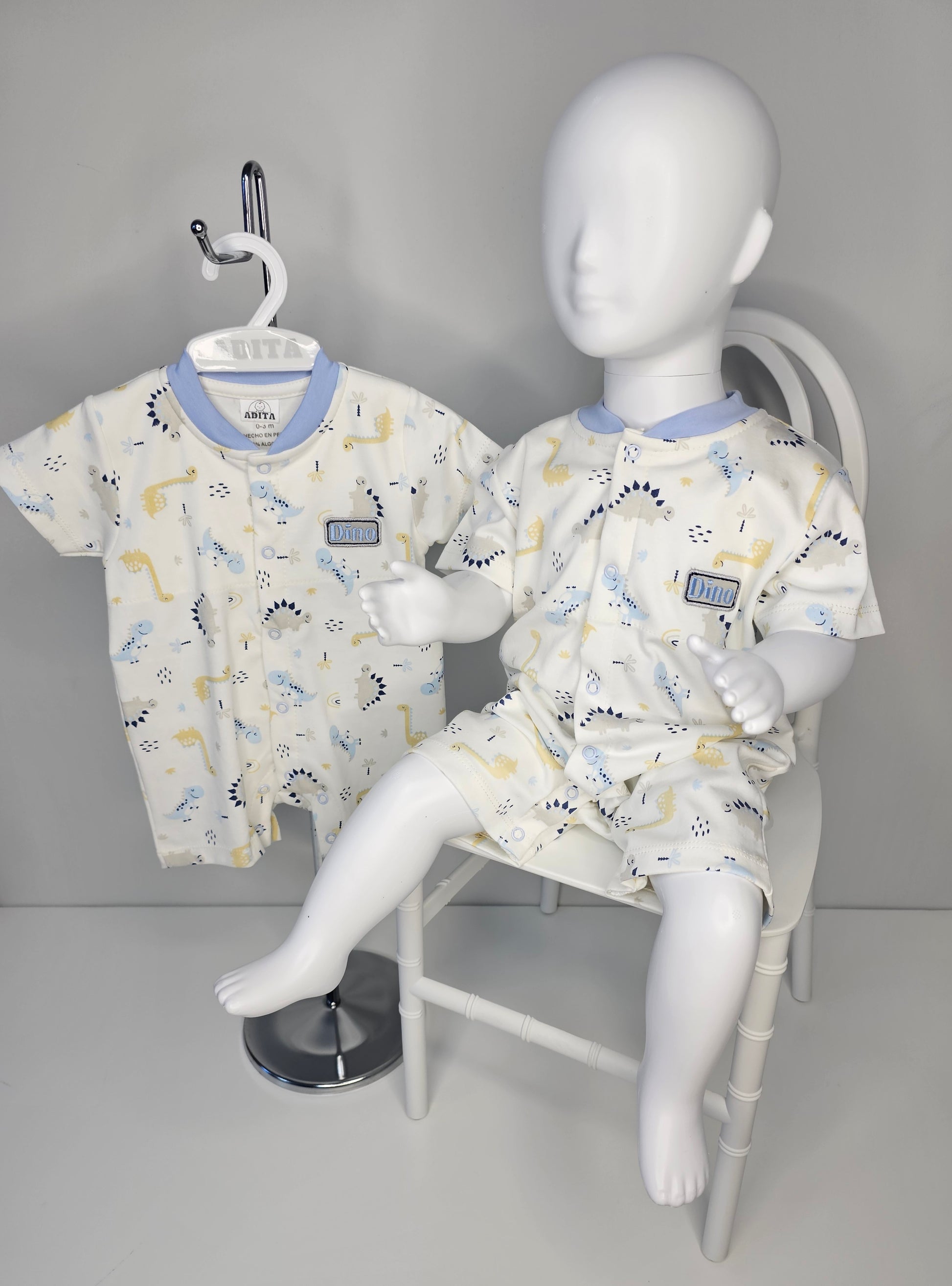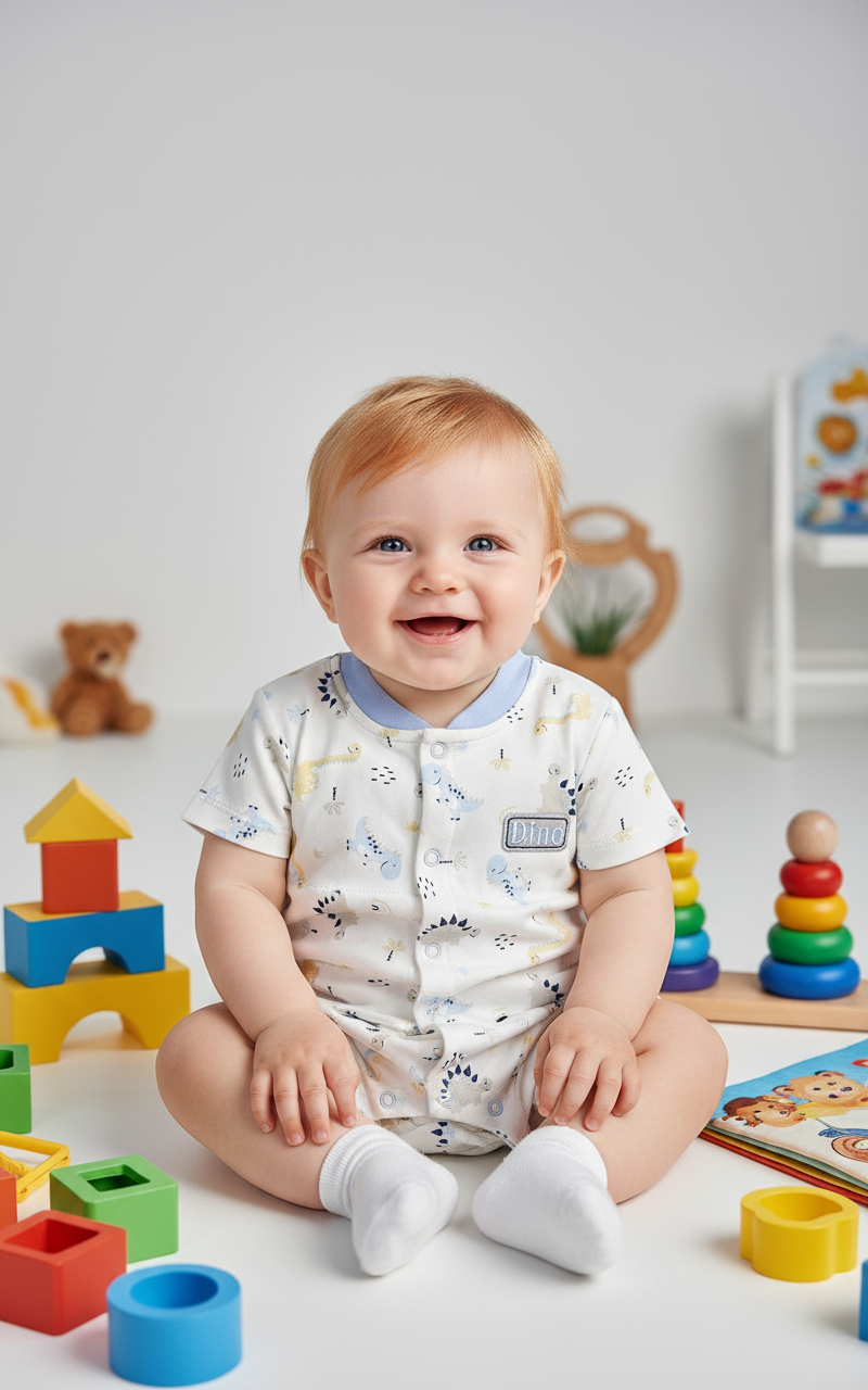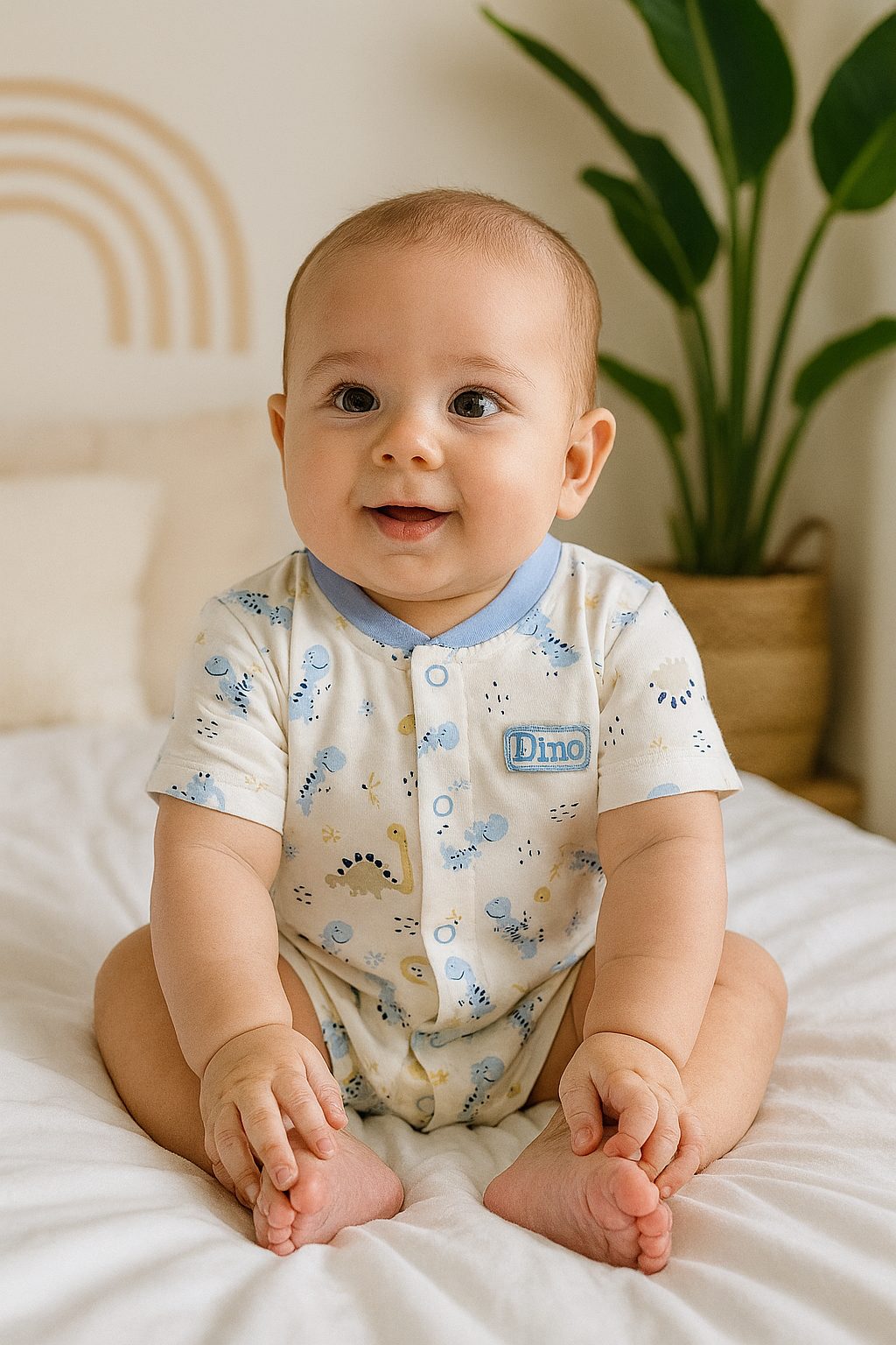El ENTERIZO DINO REX EN COLOR CELESTE está elaborado con algodón pima, lo que lo hace suave y cómodo para tu bebé. Con su divertido diseño de dinosaurio, tu pequeño estará a la moda y listo para explorar. ¡Haz que tu bebé destaque con este enterizo exclusivo!