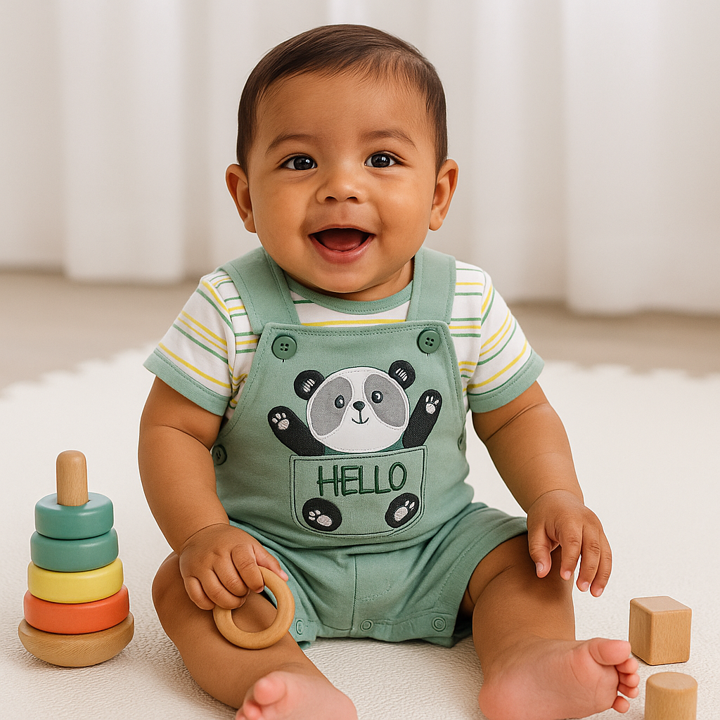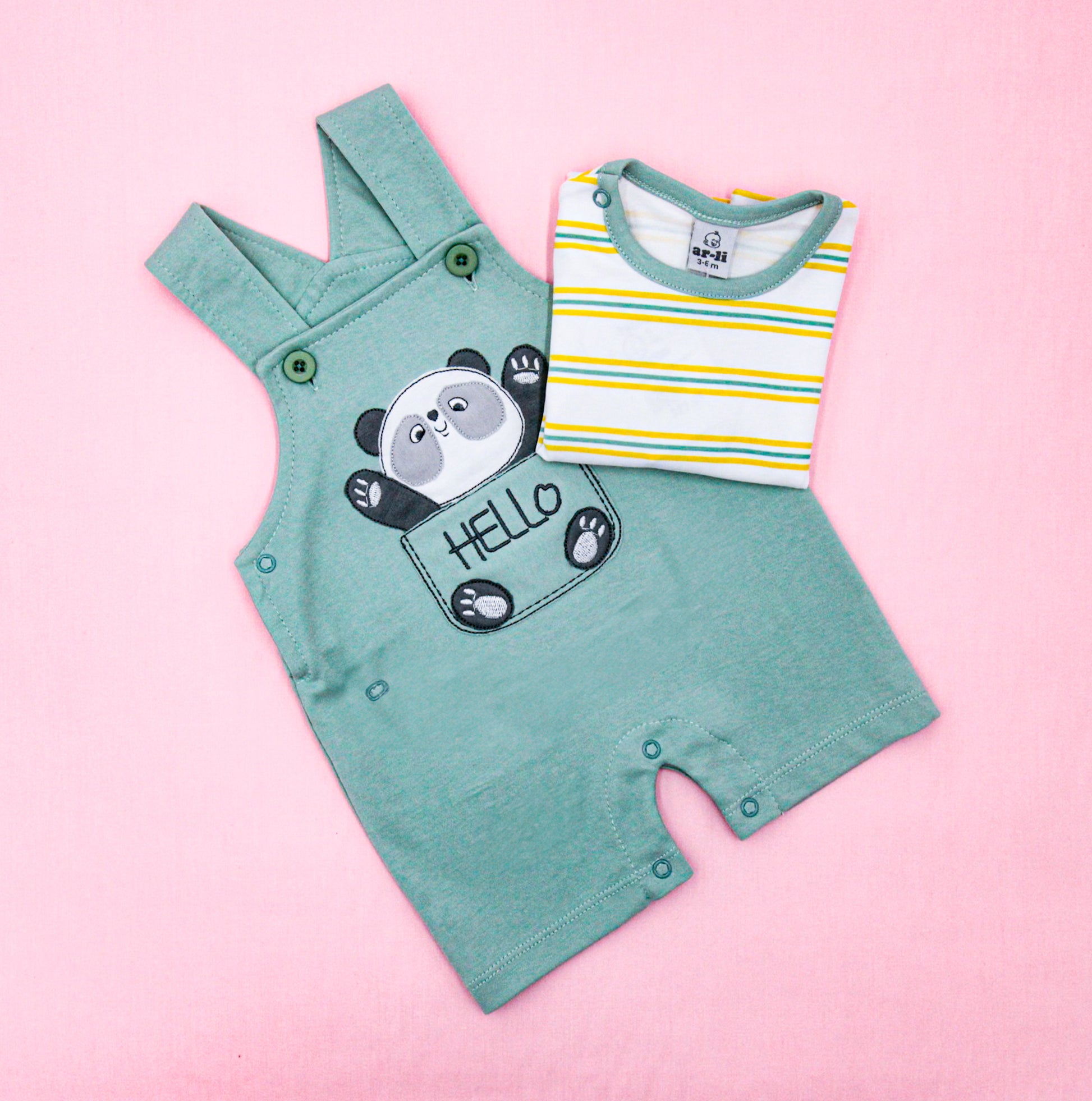 ¡Viste a tu pequeño con estilo con nuestro Overol Varoncito Pandita! Con un moderno diseño de overol corto en color cemento verde y un lindo polo a juego, tu bebé lucirá a la moda y cómodo al mismo tiempo. ¡No te pierdas esta oportunidad de vestir a tu pequeño con lo mejor!