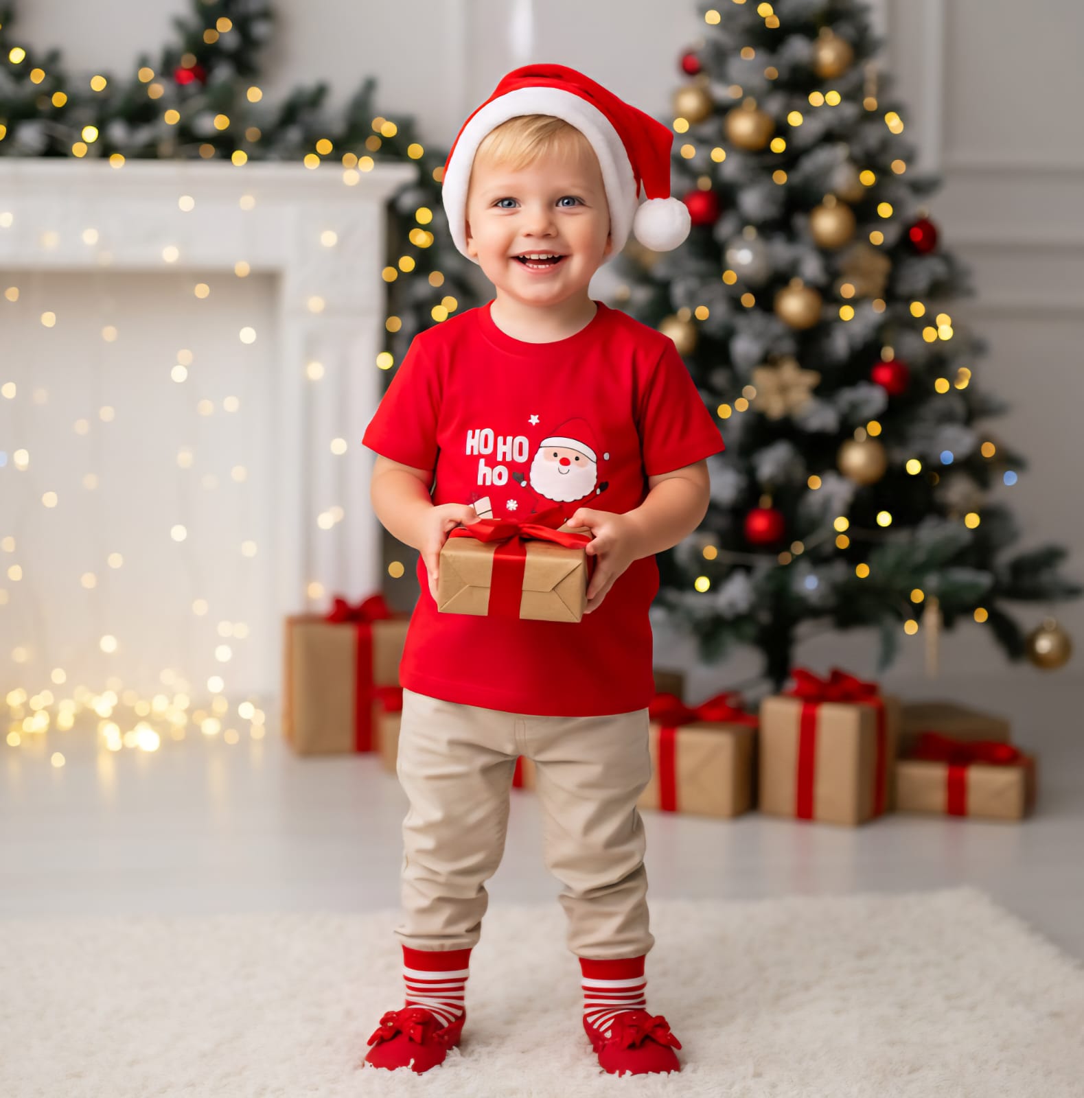 Este polo de manga corta para niños, de color rojo festivo, es ideal para las celebraciones navideñas. Su diseño pensado para los más pequeños combina comodidad y estilo, facilitando el movimiento durante las actividades diarias. Perfecto para crear un ambiente alegre y temático en la temporada navideña.